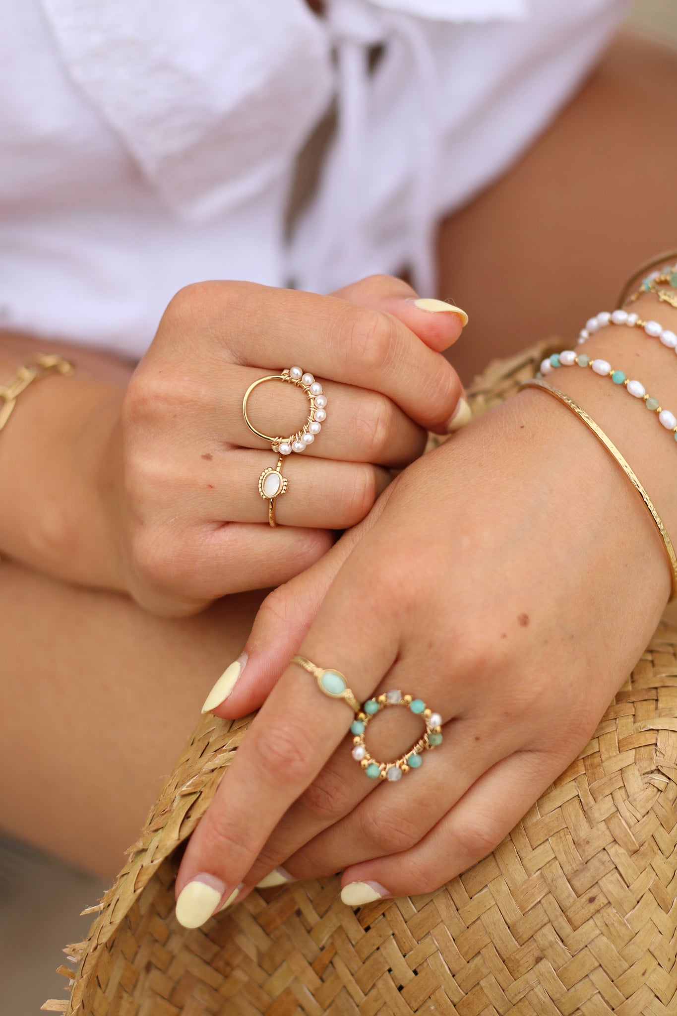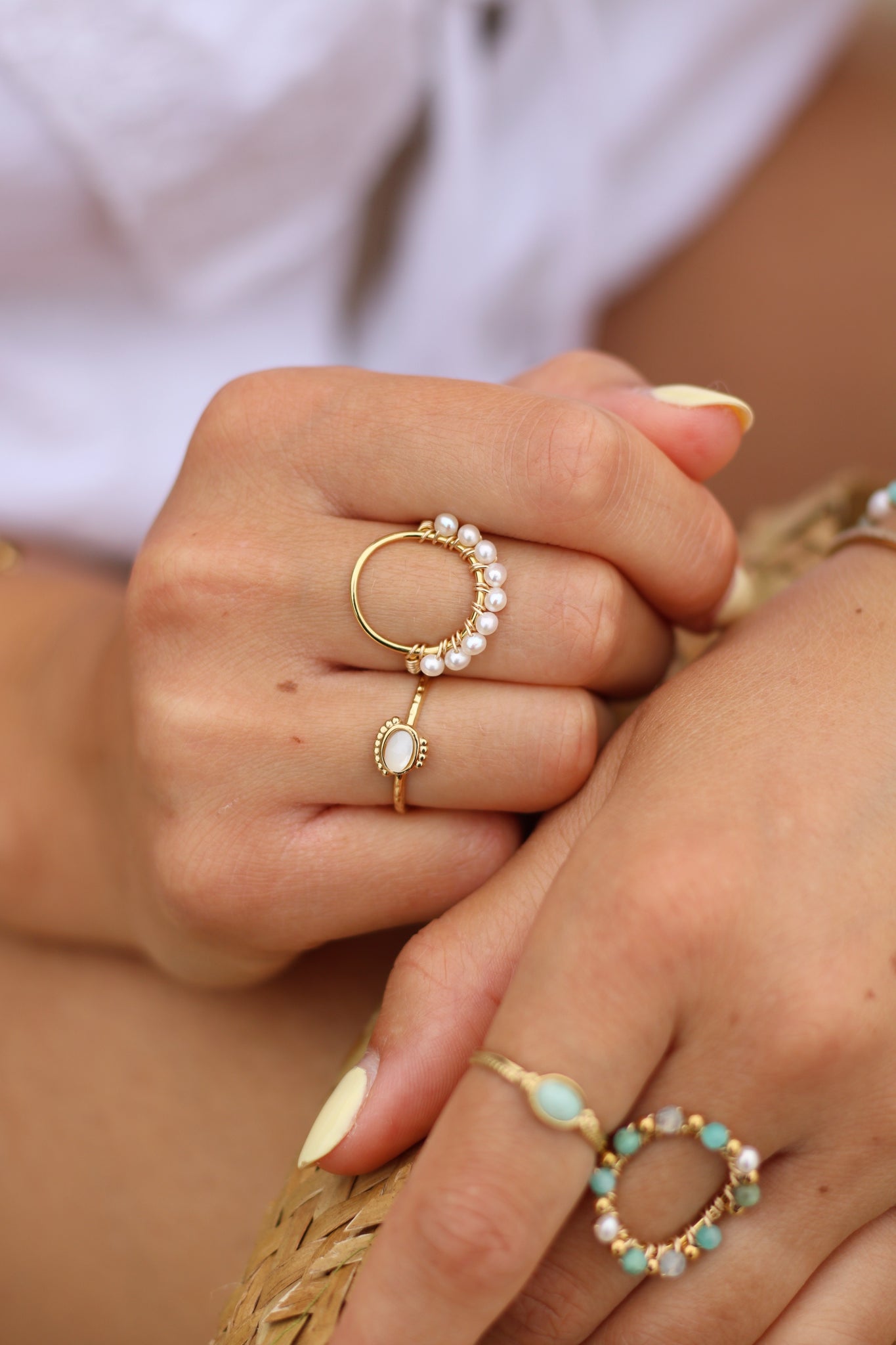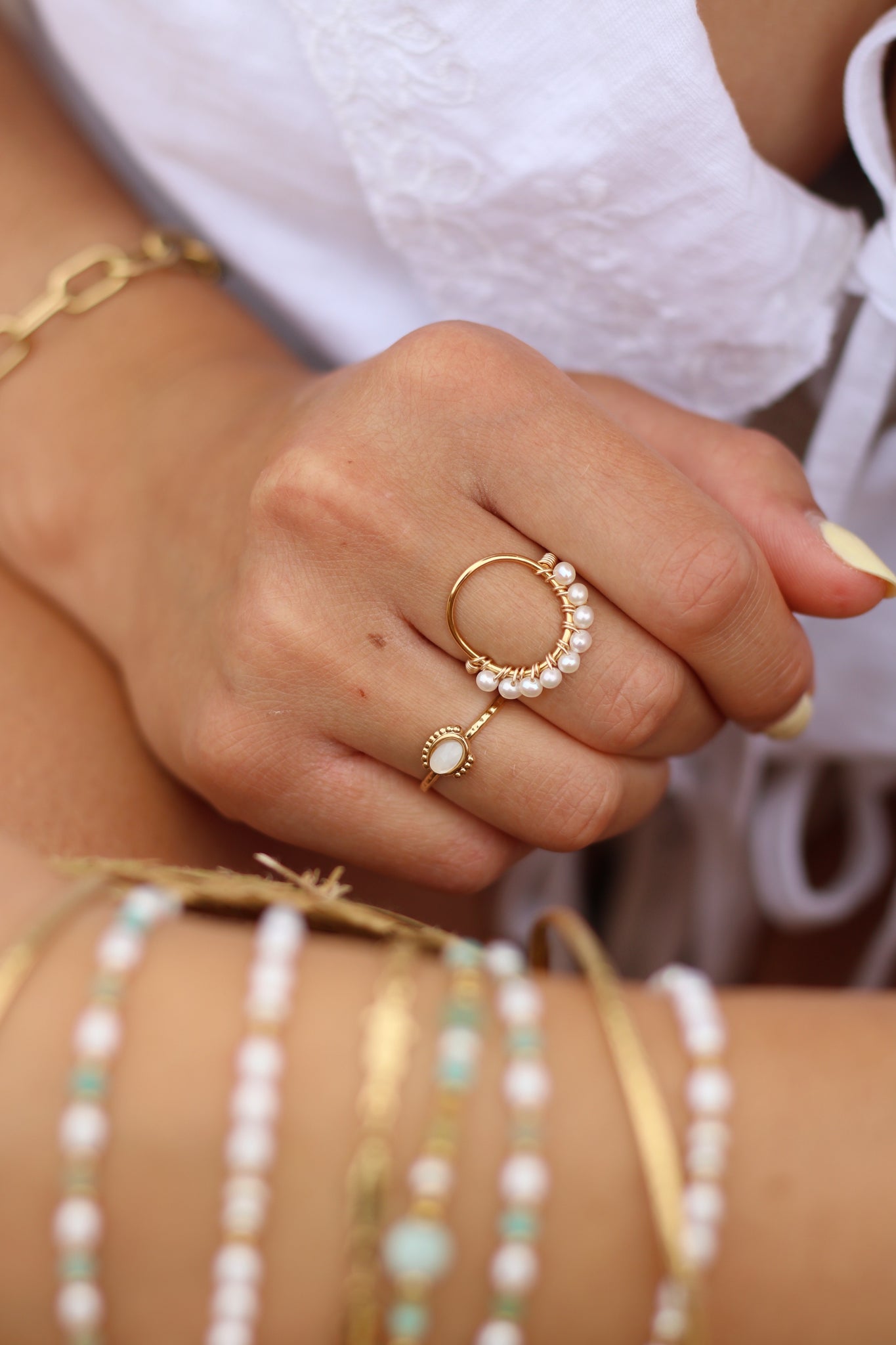 • Perles d'eau douce blanches, tissées à la main