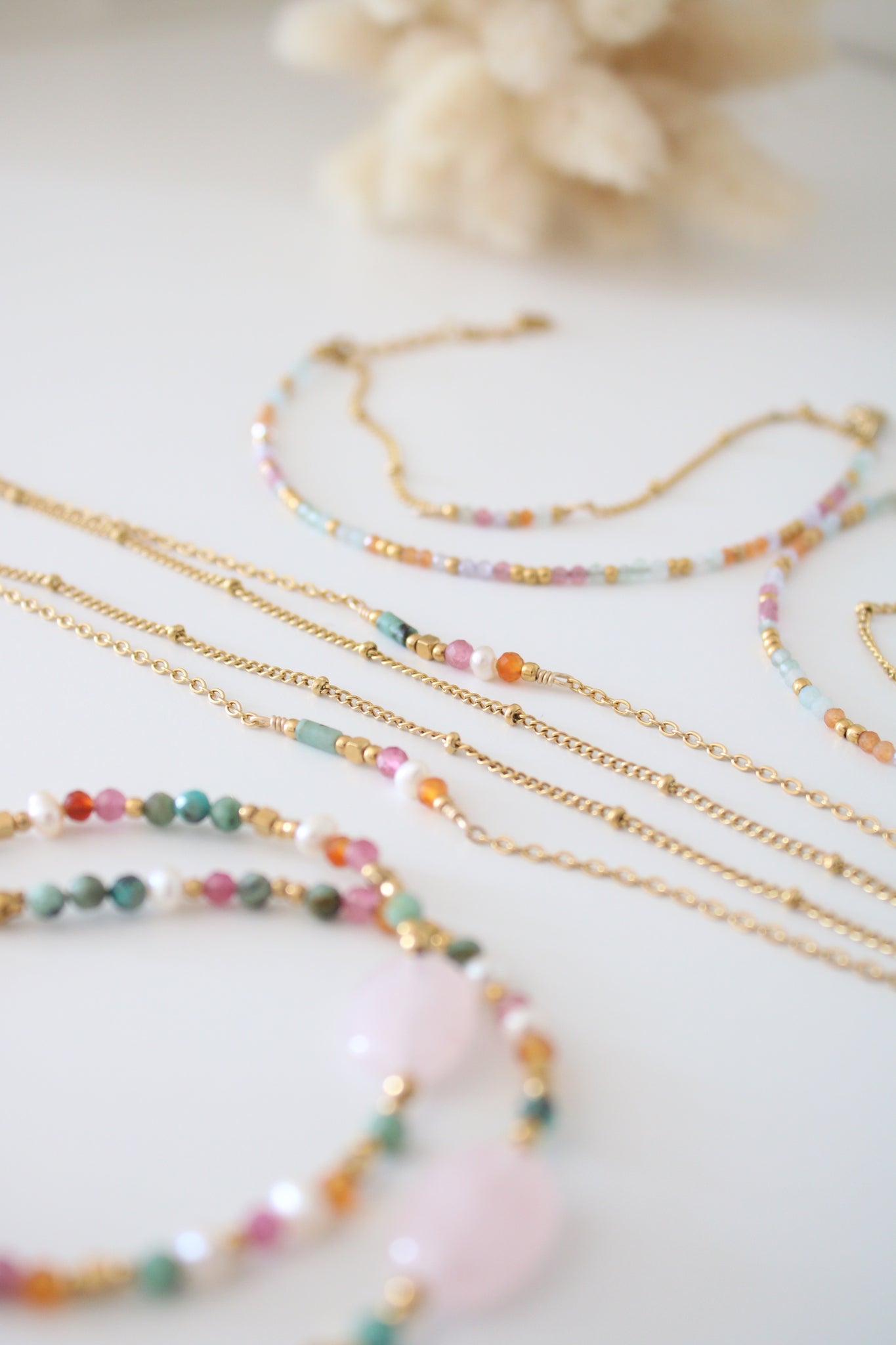 - Bracelet double chaîne dorée et pierres naturelles: turquoise africaine, agate orange, tourmaline et perle d'eau douce blanche