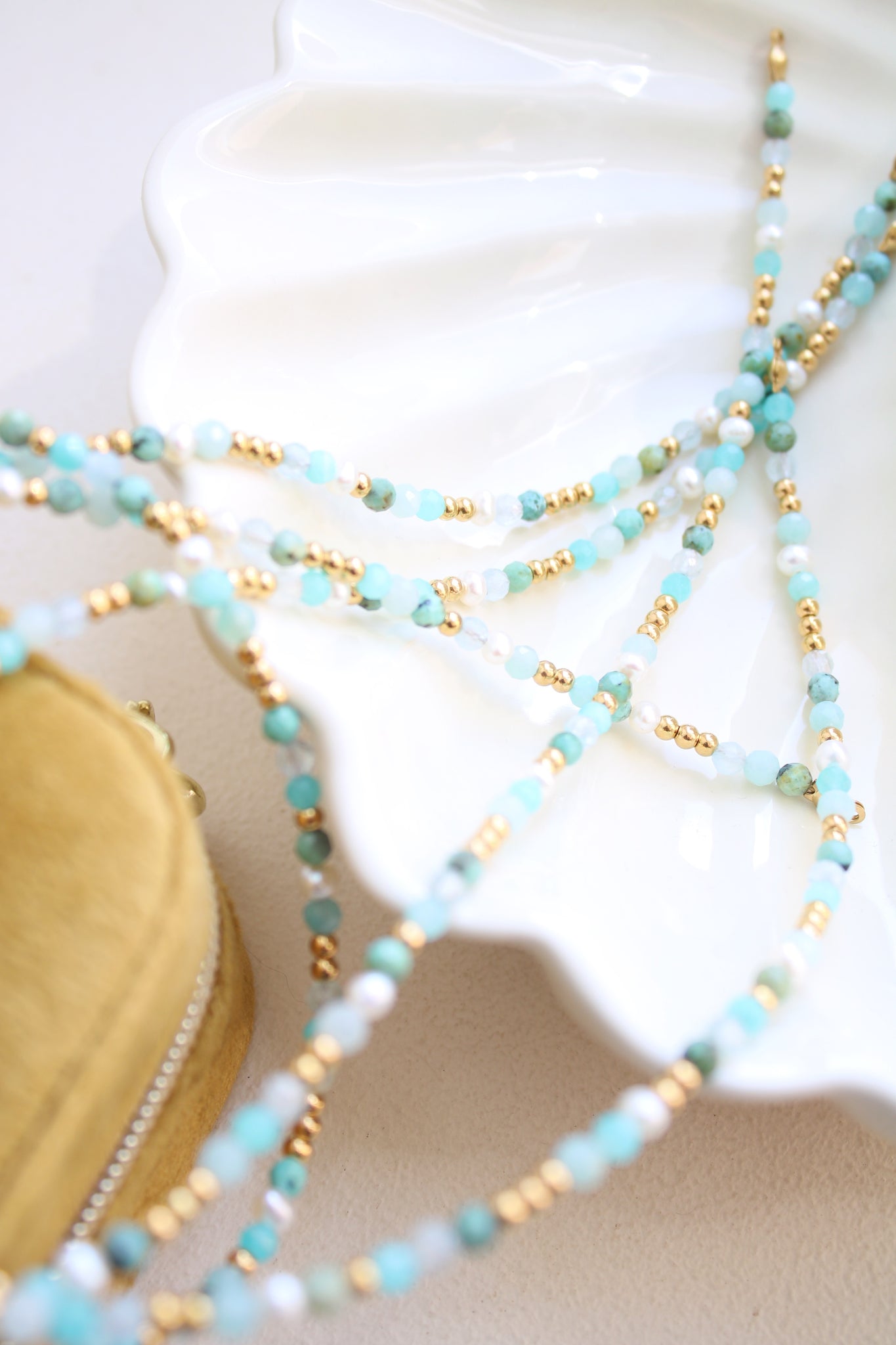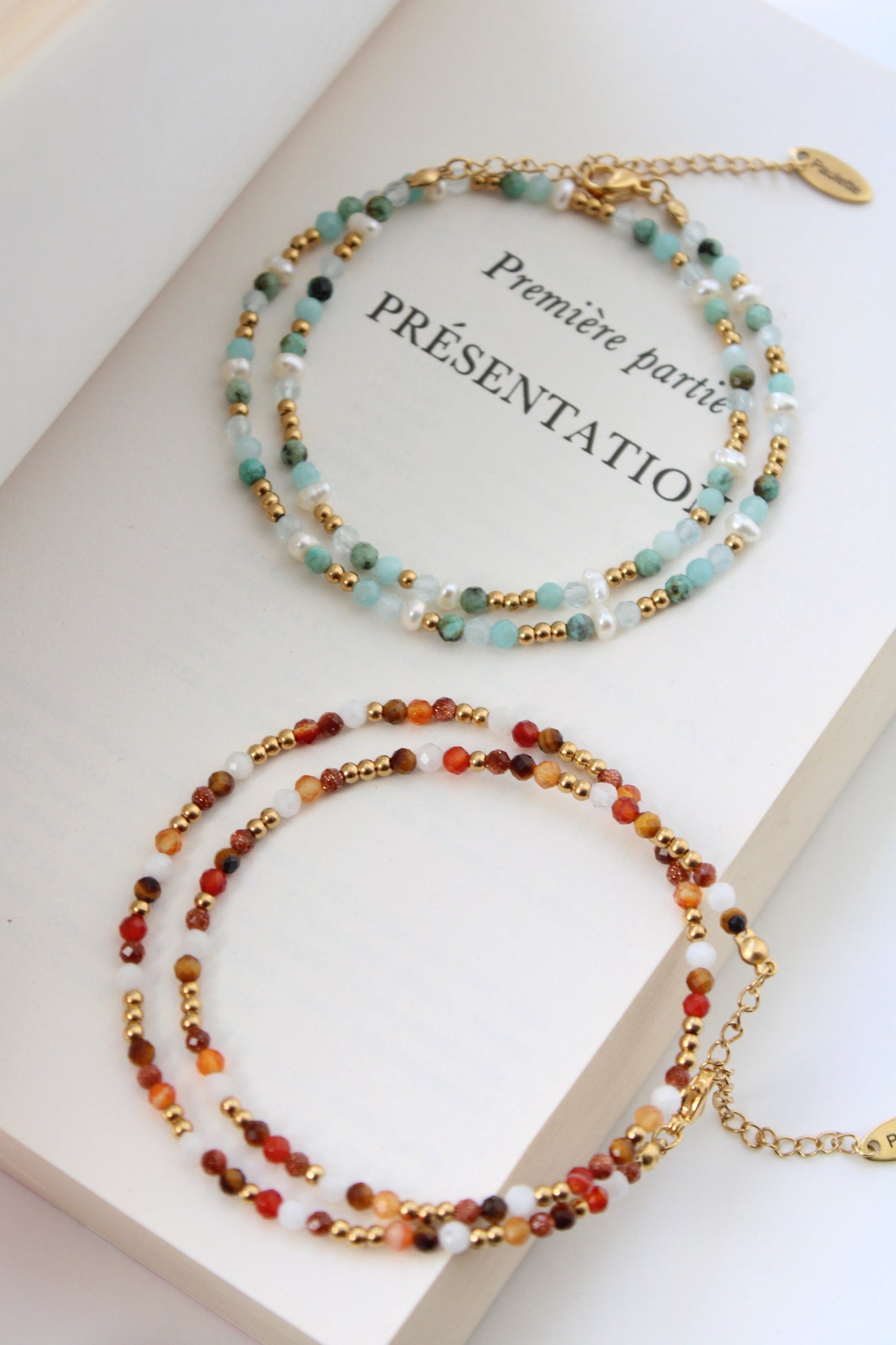 - Bracelet double tour en pierres naturelles facettées: turquoise africaine, amazonite, aigue-marine et perles d'eau douce